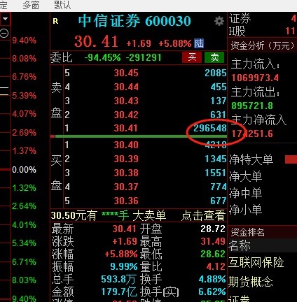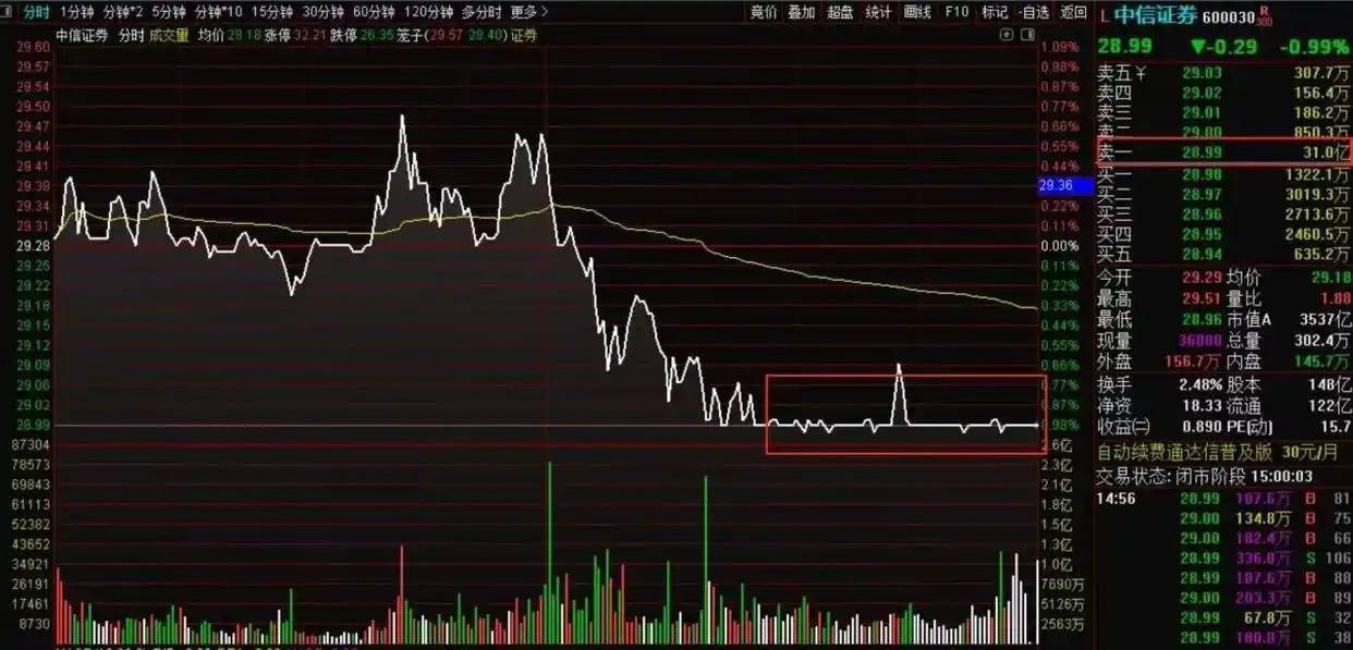 9月29日,中信证券尾盘再次出现巨额压单的情况,卖一压单高达29.65万手,约9亿元。当天午后中信证券一度大涨9.4%,逼近涨停,不过随后中信证券出现回落,当天最终以6.07%的涨幅收盘。